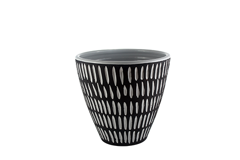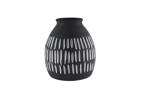 Material: Vaso de cerâmica, com formato de redondo, na cor rustica preta, com decoração branca, intitulado *African Melinde*.